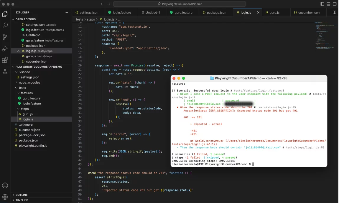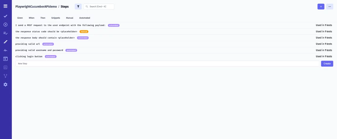 In the created file, you can implement the logic for each step defined in your feature file. Generally, step definitions are used to interpret Gherkin’s steps, execute actions like making API requests, and use assertions to validate API responses.