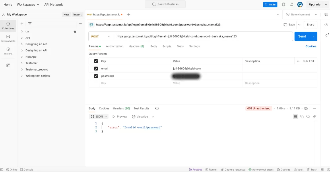 My test failed as the email is wrong, I know it. In addition, I checked this POST request with Postman also, you can see it better now.