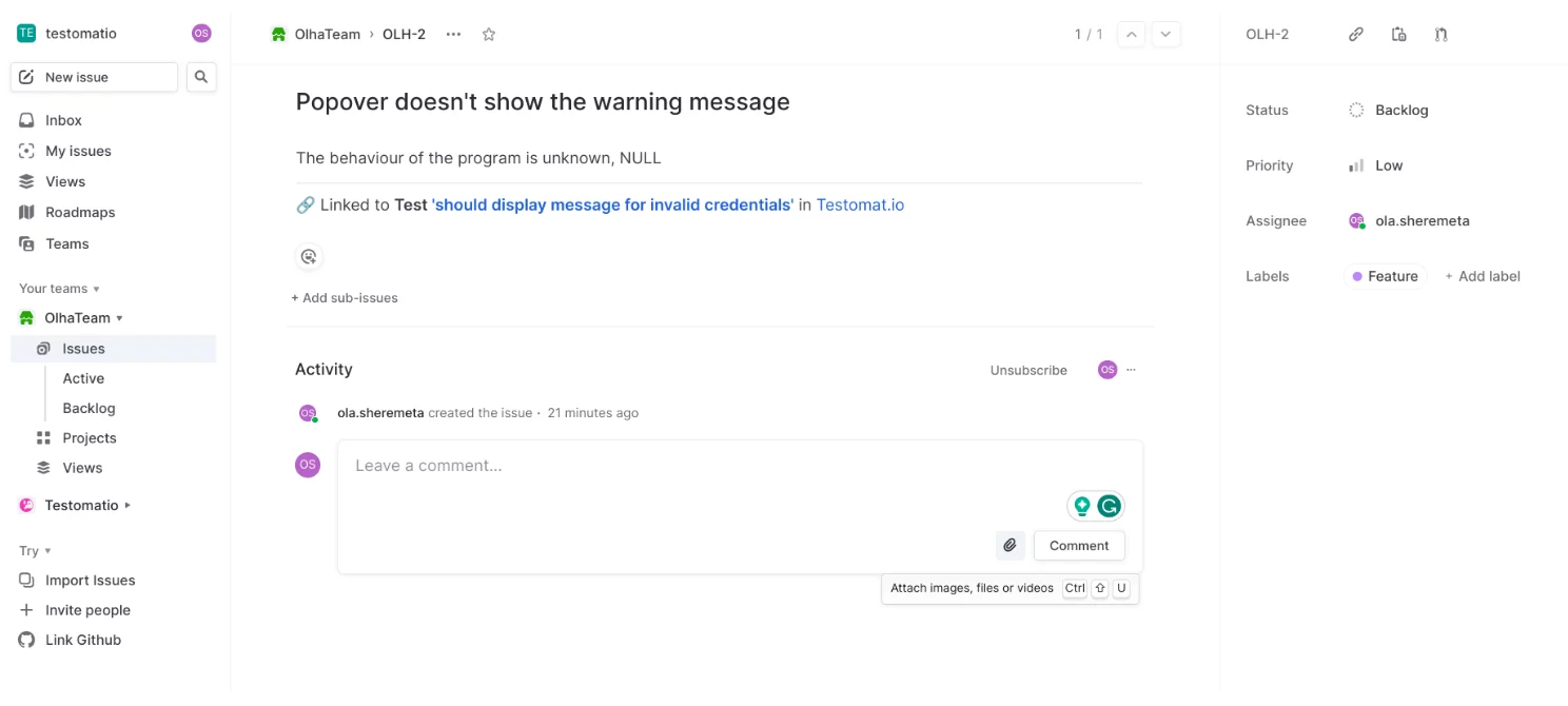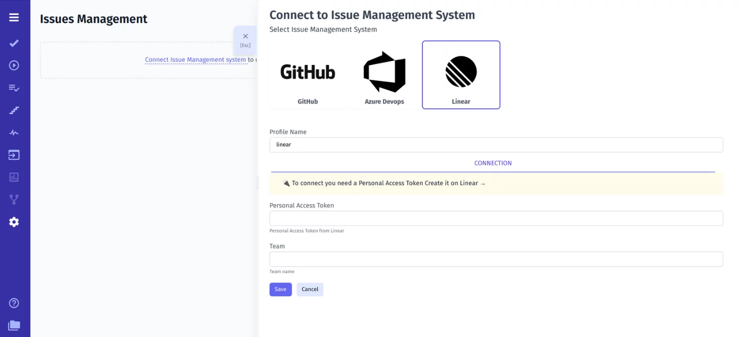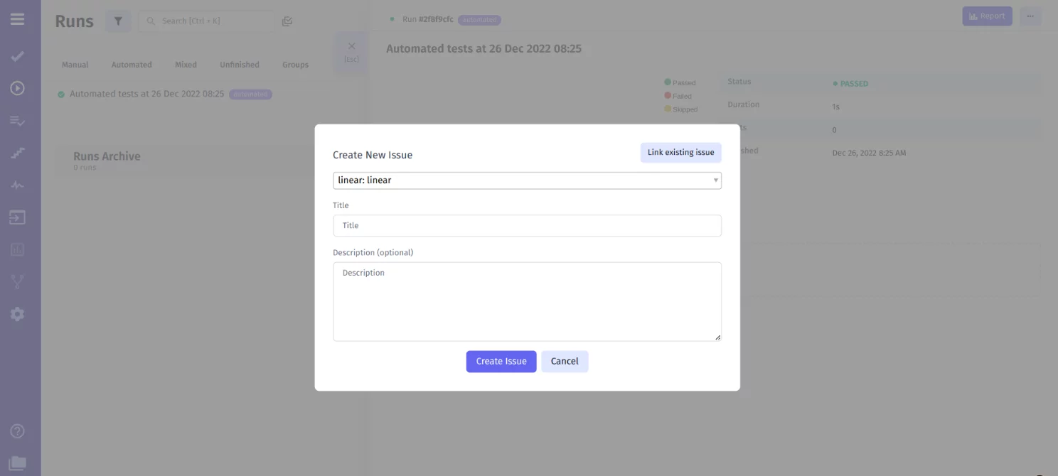 Our test management tool offers integrations with various project management and tracking tools, including the Linear integration. Details of issue integrations in Docs. Once you have defined your needs and selected Linear as an error-tracking tool, make sure that you can integrate it into your test management system.
