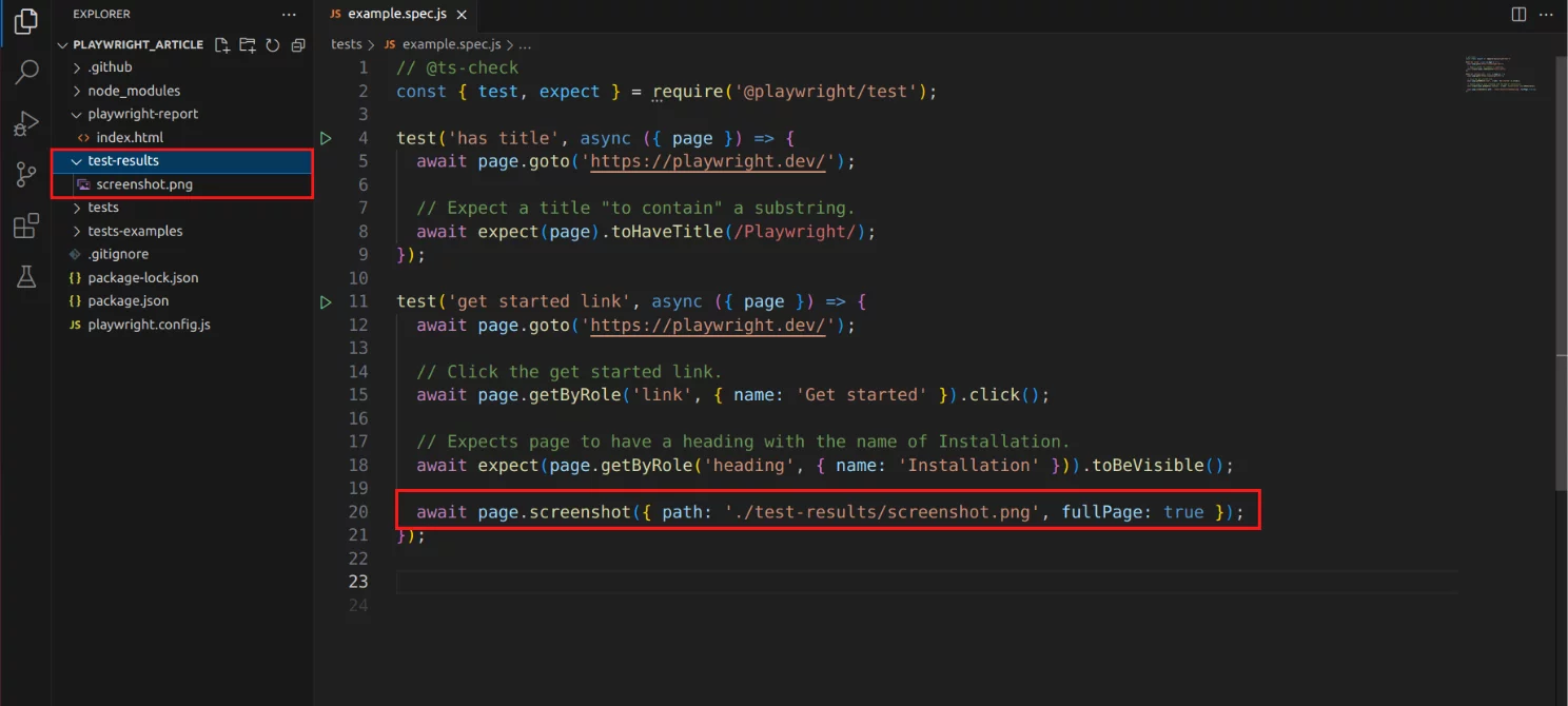 At first, have take a look at an Playwright example screenshot based on a initial JavaScript Demo Project. If you can see in it, to take a screenshot in Playwright, you should use the screenshot method, applying options like the screenshot specified path, full page capture, image format and saving it as screenshot.png in the appropriate directory: