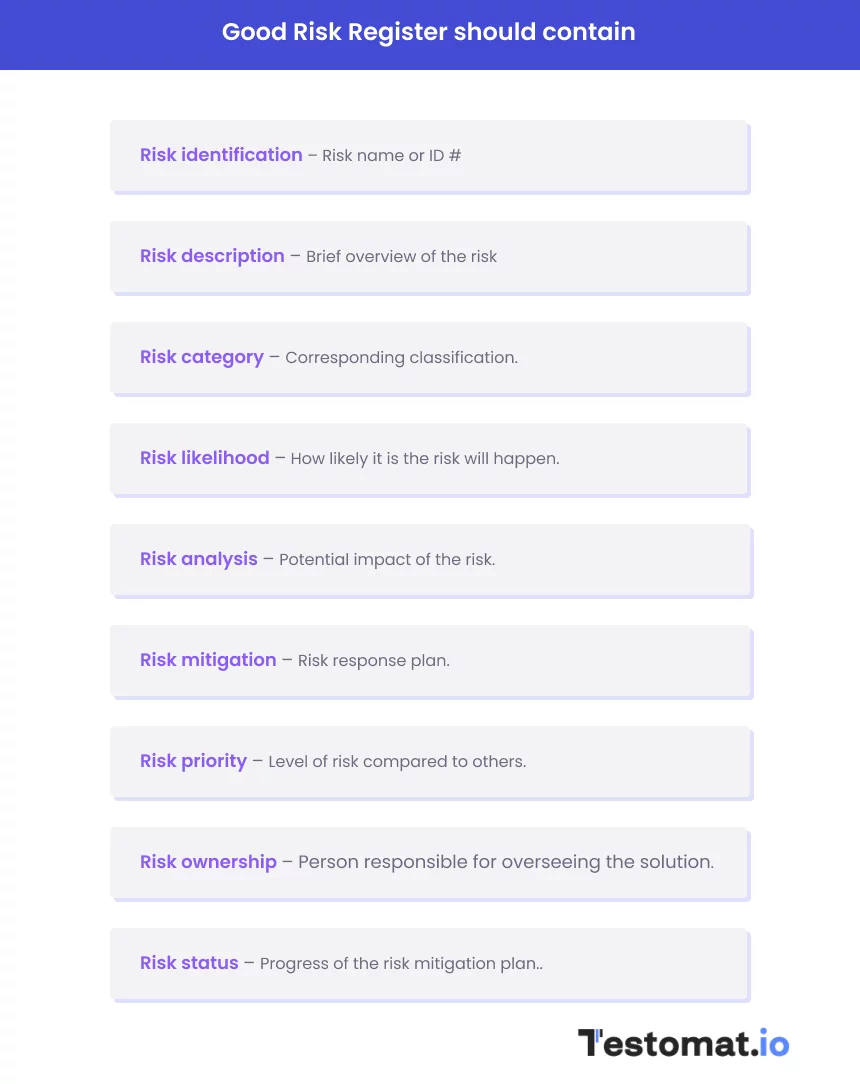 🔴 Please note: Risk registers are often ineffective because teams write them for specific tasks but attempt to use them across different projects. However, you should understand that risks vary from project to project, and most importantly, their impact and probability change.