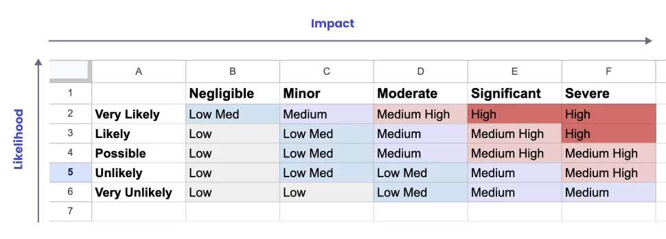 To build a risk matrix, you can use Google Sheets. In this case, the matrix will take the form of a regular table where each risk is assigned a coefficient based on its likelihood and impact: