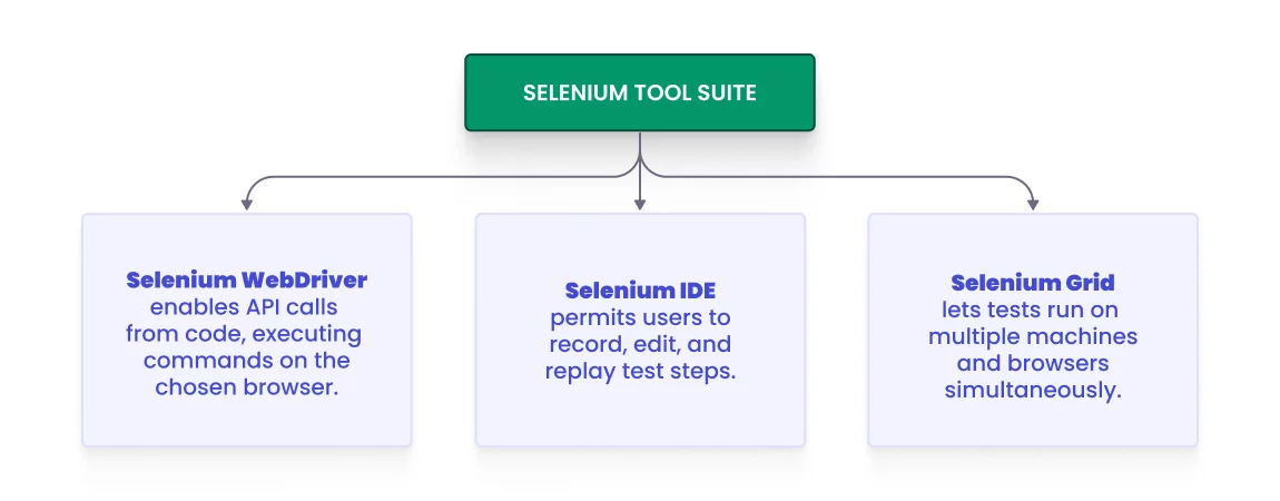 - Selenium WebDriver is an API library that is invoked from a script to execute commands in a chosen browser. Using Selenium locators, it is possible to find and define elements for creating test scripts and interact with them. For each browser, there are specific drivers that interpret the scripts written for them.