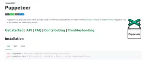 Puppeteer is a Node.js library created by Google in 2017 and is currently maintained by the Chrome dev team. It provides a set of APIs for interacting with web pages. Among the key browser automation tasks are web scraping and automated testing in both headful and headless modes.