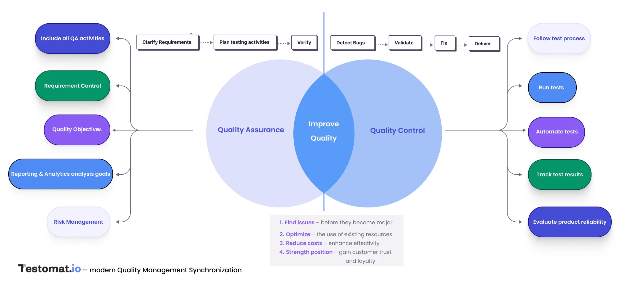 | Process Participants | QA team (QA Manager, QA Engineers, Test Automation Engineers, BA, Project Manager) | QC team (Testers, Test Engineers, DevOps Engineers, Release Managers) |