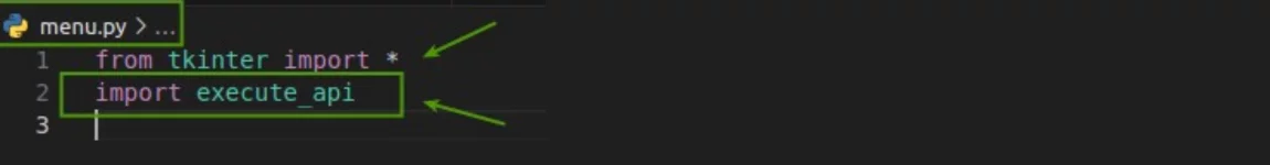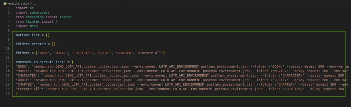 Now, please open the file execute_api.py and let’s create the screen for executing our Newman tests through the methods attached to the buttons of the page by importing the Tkinter library in the execute_api.py file.