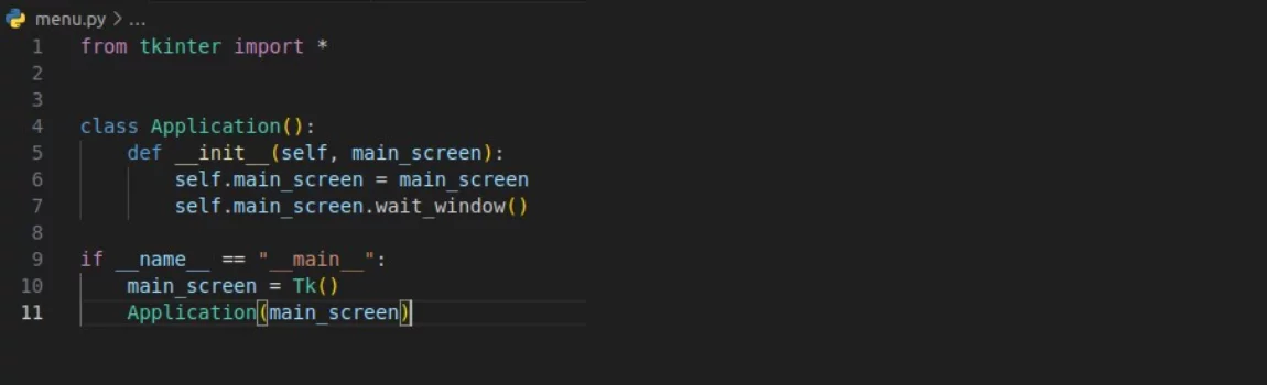 First of all, create a Python file called menu.py Next, import the tkinter lib and create a class called Application which will contain all the elements of the main menu. Then, call the screen by adding the if __name__ == "__main__":