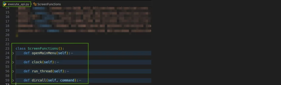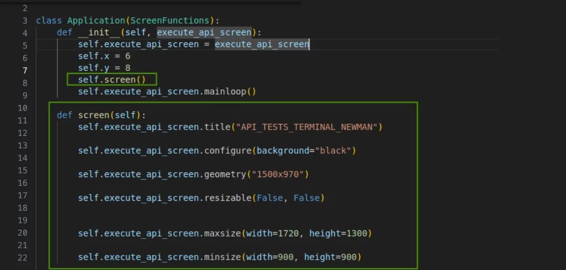 Let’s do the final steps to show the results of the Newman command in our screen in the file execute_api.py. Under the class ScreenFunctions, create the following methods as shown below clock method.