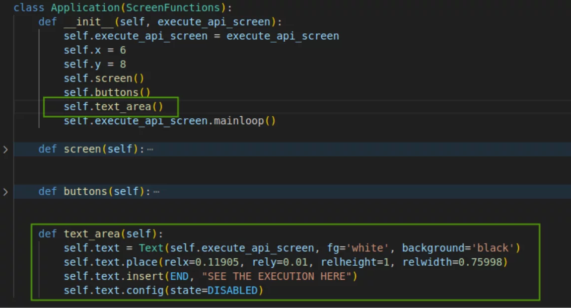 Under the class Application, create a method called text_area which will send the terminal output generated from the Newman command execution. Call this method in the initialization: