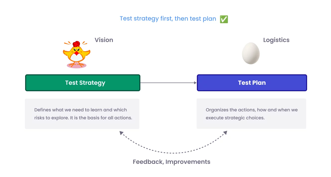 Many think this is a “chicken and the egg” situation, but it is not. A good plan is born from a clear understanding of why a specific strategy was chosen. That is the only way to move forward and effectively solve the testing problems. At the same time, without a plan, we cannot validate whether the strategy actually works in reality.