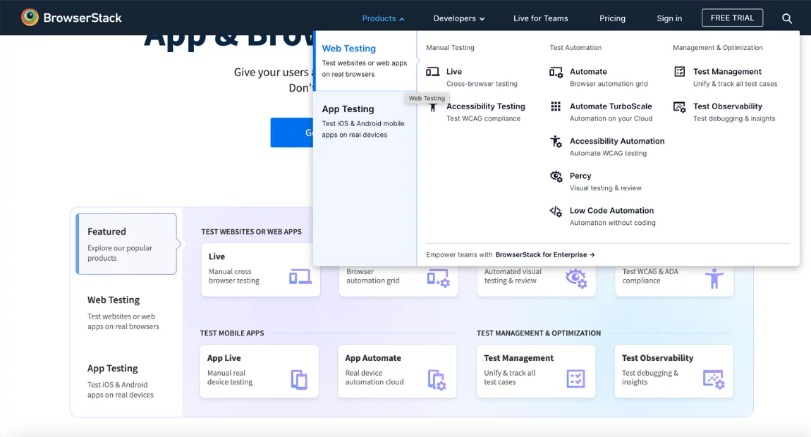 - Support for various types of testing, including mobile and web application testing, API testing, accessibility and performance testing