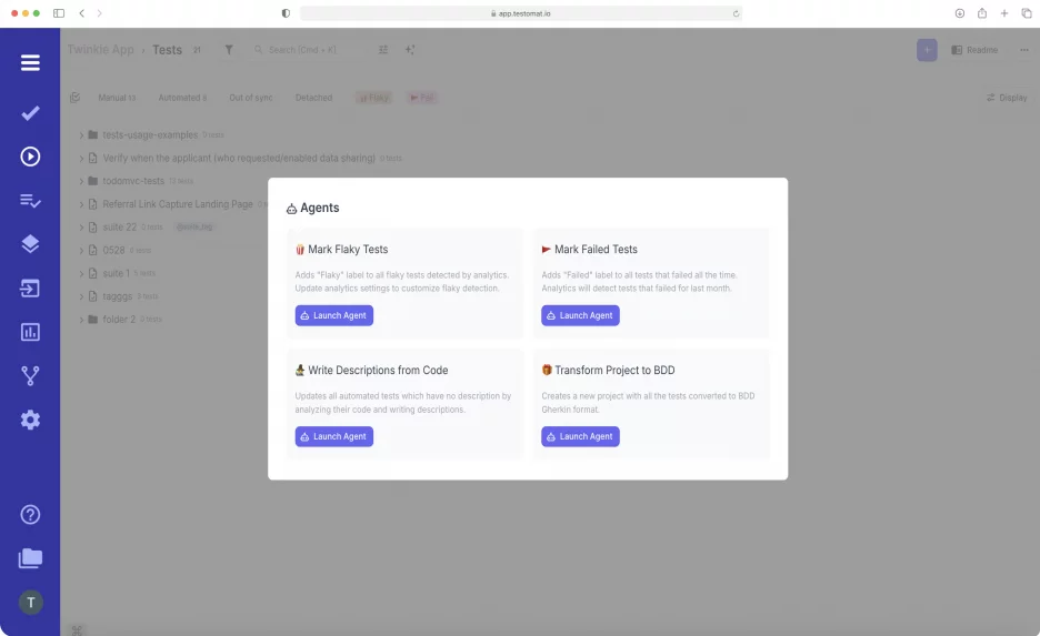 AI agent acts as your ever-present testing copilot, guiding through a UI dialogue window. You can use it when you wish. To get started, simply click the AI star button. You can see it in different parts of the project. For instance, on the level of test plan, test suite and folders, as well as test result reports, e.g. Our team is constantly working to increase the AI agentic handy presence on your project.