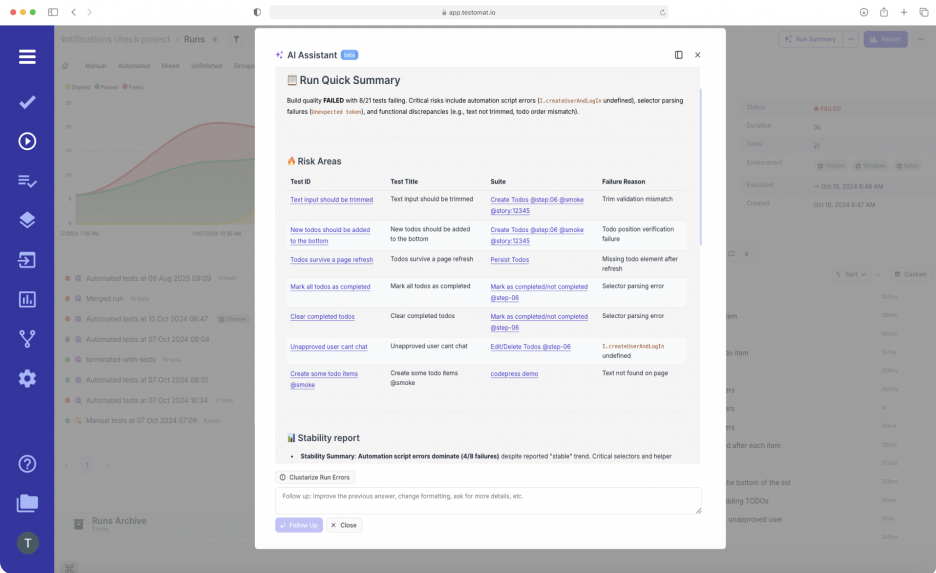 - Risk areas — AI reviews failure logs and error patterns, flags flaky or unstable tests and pinpoints risky areas, helping teams debug faster.