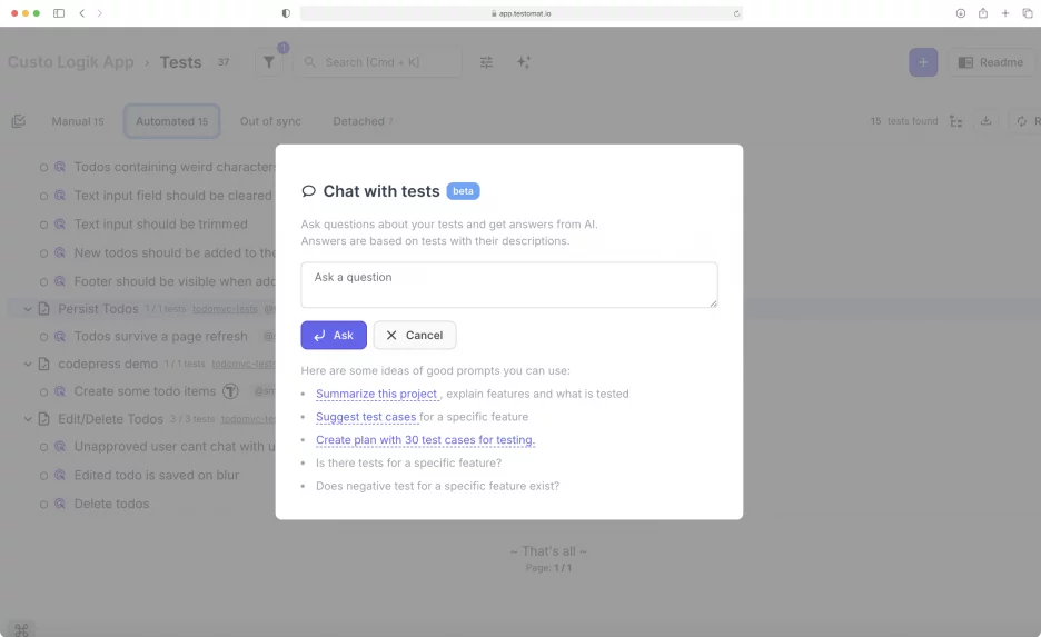 Chat with Tests is a special feature that allows you to retrieve any relevant information about the software you are testing. Our AI assistant lies within the project’s environment, providing exact, real answers on a specific topic. This eliminates uncertainty, filters out vague information, and simplifies research.