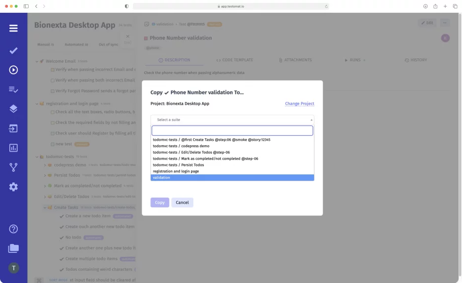 Agile teams are focused on fast and flexible project execution. We understand this desire and therefore strive to create conditions for more productive work with tests without any restrictions. Copy Tests And Suites is a useful feature for Agile software development projects. You can use previously created materials to work on other projects, thereby saving time and effort.