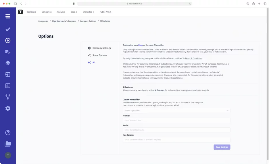 The test management system testomat.io supports tailored integration with the AI engines — teams use or trust the most. They fulfil their performance needs. Particularly, this functionality is crucial for enterprise-grade projects to remain compliant with strict internal security regulations and data-sharing policies.