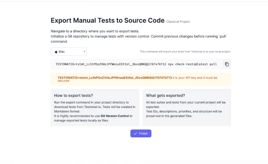 - Export and Import tests to Markdown are done using the CLI. To find out the command for how to do it, go to the test management system UI and copy the required command. Then you should run it in your project directory, where your API code will be displayed.
