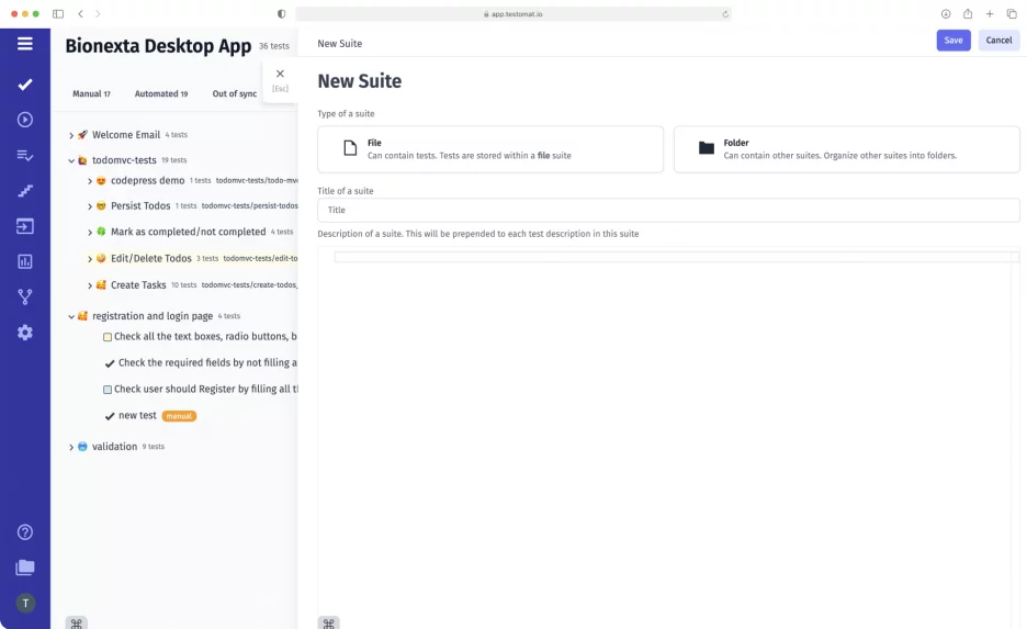 Just like your favourite test management system, supports nested suites. testomat.io provide file or folder structure of test suites, which means that the test case might be hierarchies. Other name multi-level test suites.