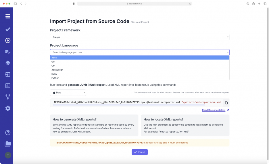 Gauge framework support provides additional flexibility for QA teams using Gauge, reduces manual linking and tracking, and enhances consistency in automated test reporting during CI\CD. The integration includes a full setup guide — commands and configuration steps are available in test management UI hints — so getting Gauge reporting working is straightforward, just like with other supported frameworks, like Cypress, Playwright, Cucumber, CodeceptJS, e.g.