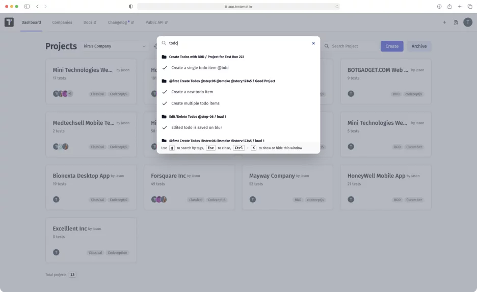 In order to use the Global Search feature call by Ctrl+K Global Search or find the search field on Project`s dashboard. Then type name or @tag within the Company. As a result the list of test cases will appear and you might choose necessary one test. If you click on it, you will see test case details and a description.