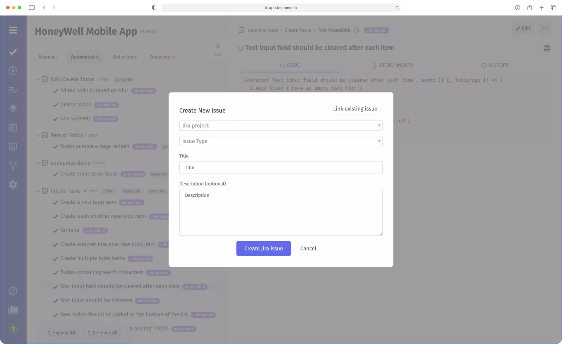 Report an issue directly from your run into your Jira project. The full description of the steps you made will be added to Jira automatically. You can also add data for relevant Jira fields while reporting the issue