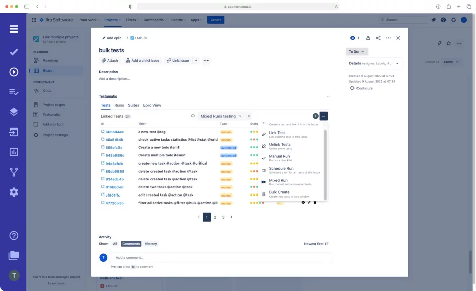 - All of testomat.io’s Mixed Run features are available when you run them from Jira, so you no longer have to switch between tools to start testing.