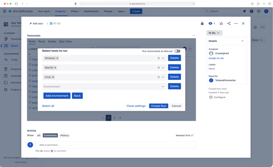 Execute manual tests on multi-environment directly in Jira within the Jira plugin in form of checklists in Jira issue separately for each environment. When you complete the tests, results will be placed in a run group in test management bi-directionally.